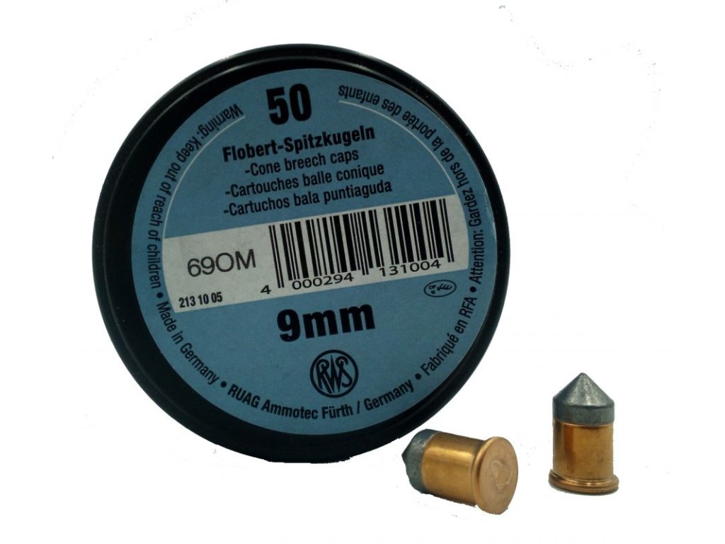 Flobertkový náboj od německé firmy RWS, ráže 9 mm Flobert, olověná špičatá střela, náboj vhodný do krátkých i dlouhých zbraní.