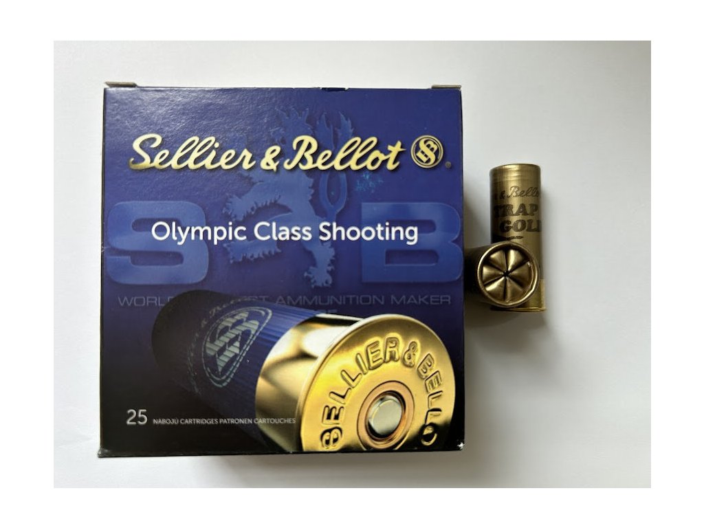 Sportovní brokový náboj Sellier & Bellot, ráže 12/70 Gold Trap 24, brok 2,4 mm, náboj určený na sportovní střelbu na asfaltové terče.