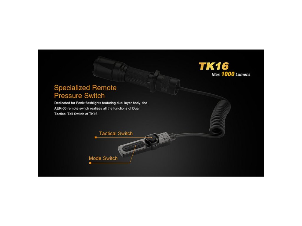 Fenix TK16 - kulatý tlačítkový spínač umožňuje momentální aktivaci svítilny jeho namáčknutím, jeho plným domáčknutím lze svítilnu zapnout klasicky na stálo. Když je svítilna zapnutá tímto kulatým tlačítkem, tak lze přepínat režimy svícení stiskem plochého tlakového spínače. Pokud je svítilna vypnutá, tak ji lze zapnout přímo do stroboskopického režimu stiskem plochého tlakového spínače.